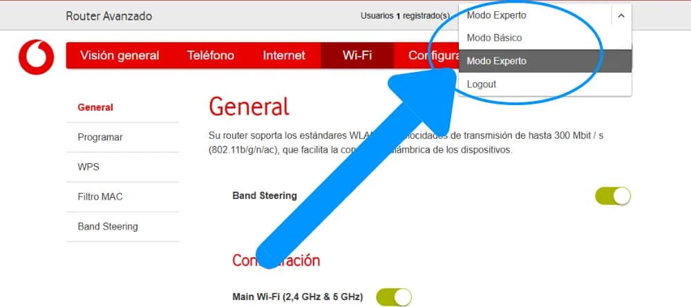 En la prueba realizada hemos entrado en un router Sercomm FG824CD de Vodafone. Para acceder a la función oculta, hemos tenido que activar el «Modo experto» que, como ves en la imagen que hemos compartido, está en el desplegable de arriba. Generalmente, al iniciar sesión, aparece activado el «Modo básico», por lo que este paso es importante.